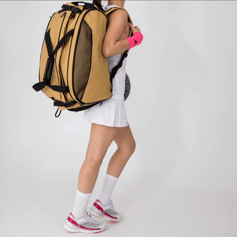 The perfect padel bag for padel players. Its flap-opening design offers a large central compartment for clothing and equipment. Thermal side pockets for two racquets, a ventilated bottom compartment for shoes, and several pockets for small items. Adjustable straps and adaptable handles ensure comfort. It also features the exclusive Ale Galán label.