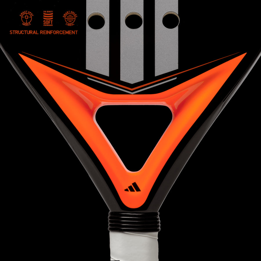 Smart Holes Linear: The equidistant hole distribution in groups of three makes the racket more resistant. The alignment of the holes makes it more compact in the areas where most impacts occur, thus significantly extending its lifespan.