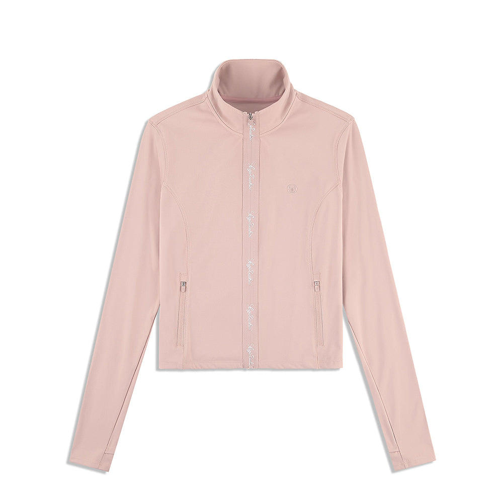 Crafted from lightweight performance fabric that's buttery-soft, stretchy, and supportive, this athletic jacket is cut with an aqua zipper featuring a repeat script logo down the front. Handy thumbholes keep the chill out, while flattering princess seams contour the body for a feel-good fit.