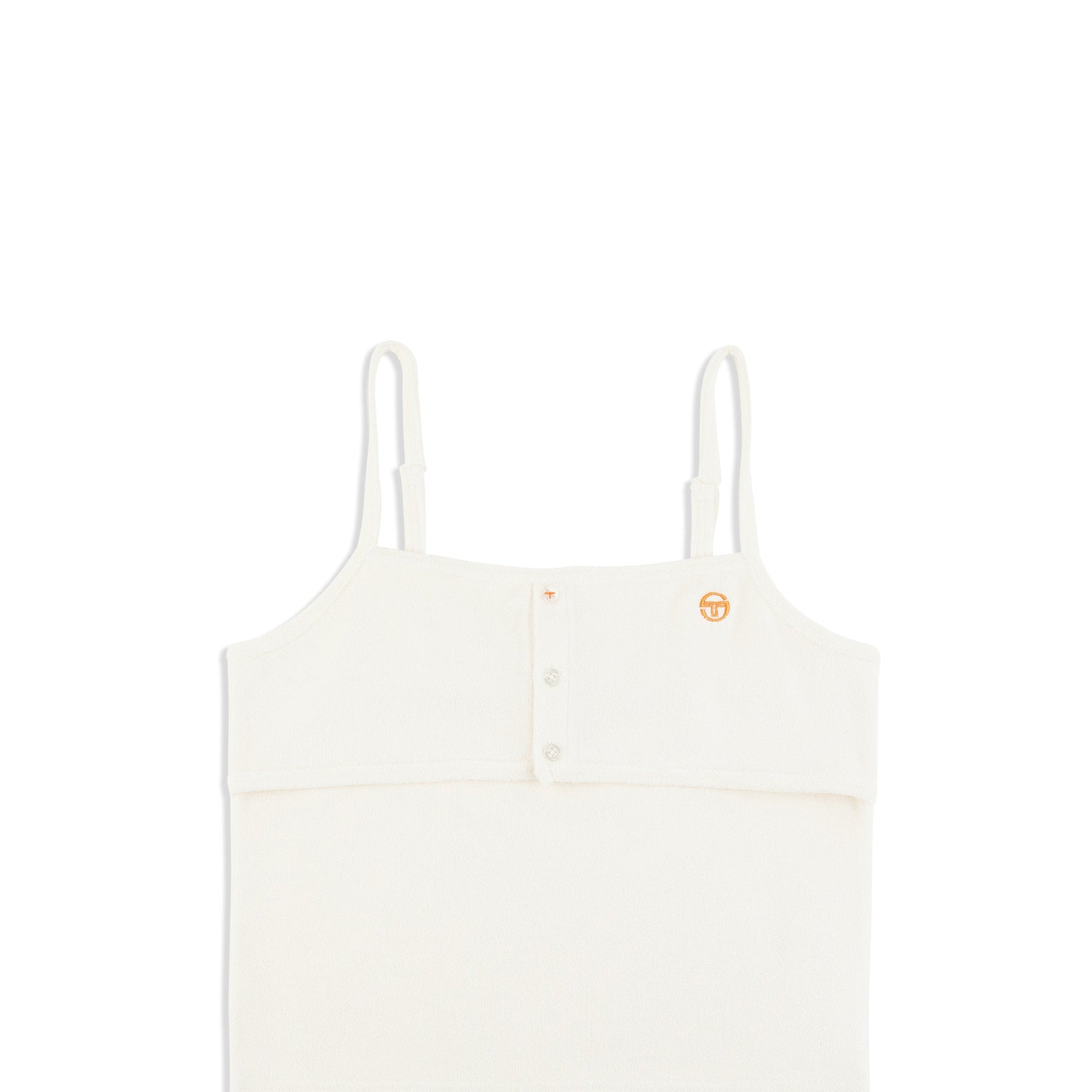 Perfect for summer beach trips, sports activities, or city strolls. The Edda Tank Top is crafted from super soft terry toweling fabric in a cropped cut with adjustable spaghetti straps. Featuring a buttoned overlay chest panel for added support, this casual tank is an easy-to-wear wardrobe staple.