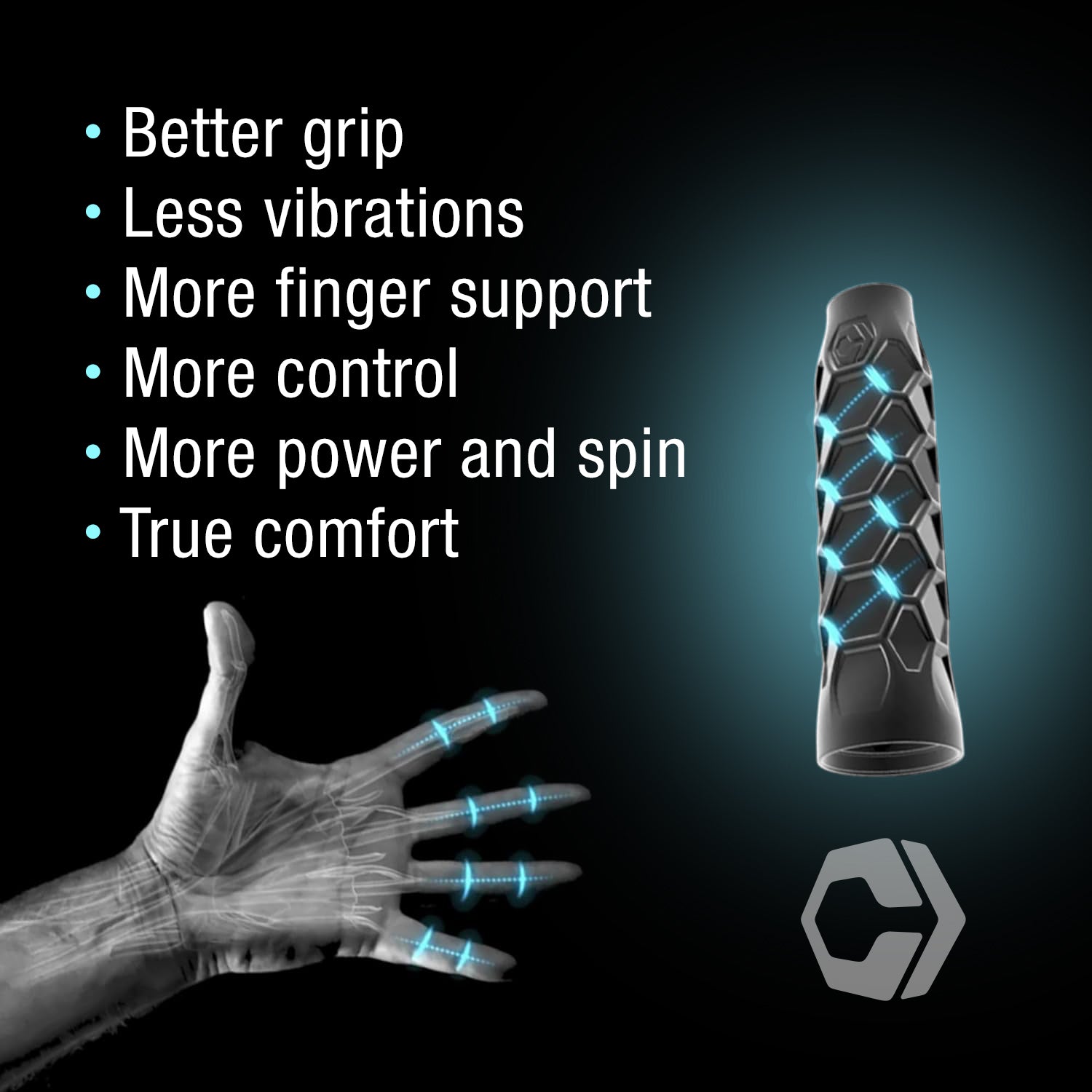 Hesacore Tour Grip Carbon is the new grip designed with carbon filaments that make the handle stiff for any hand, decreasing the “handle” stress. It is also anti-vibration, anti-sweat and anti-humidity. The best way to increase your performance with the greatest possible comfort.