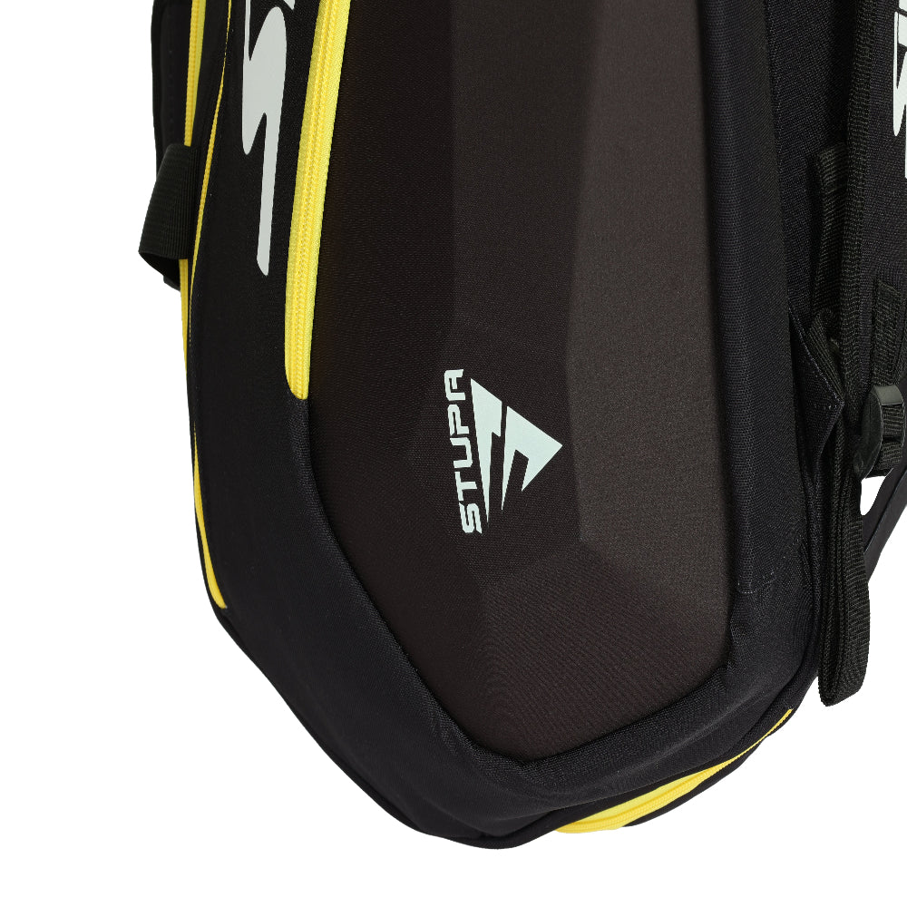 The Siux Electra Stupa SS24 Bag, designed for padel players, offers ample storage and durability for all your gear. Crafted with high-quality polyester and rigid side panels, it provides impact protection for up to 9 rackets in its two thermal-insulated side compartments. The spacious central compartment holds clothing and accessories, while a top pocket secures small personal items and side zippered pockets keep essentials accessible.