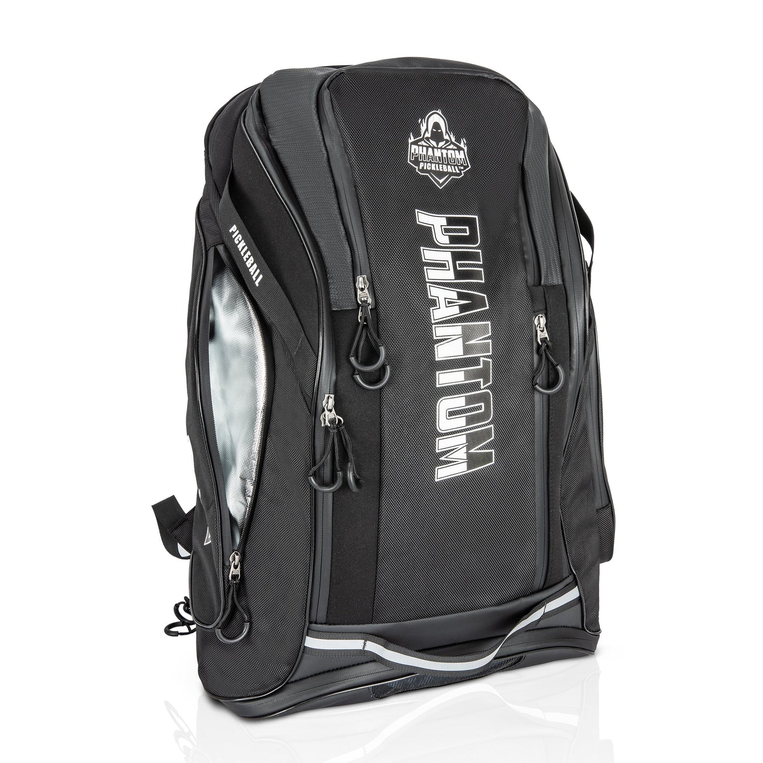 The Phantom Tour Bag includes two large pockets with thermal insulation for snacks, large main compartment that can hold 6-8 pickleball paddles, 17” laptop sleeve for travel, large mesh pocket inside for pickleballs, two front accessory pockets for your keys, phone and other essentials and more. Also includes a vented shoe storage on the bottom for your stinky stuff.