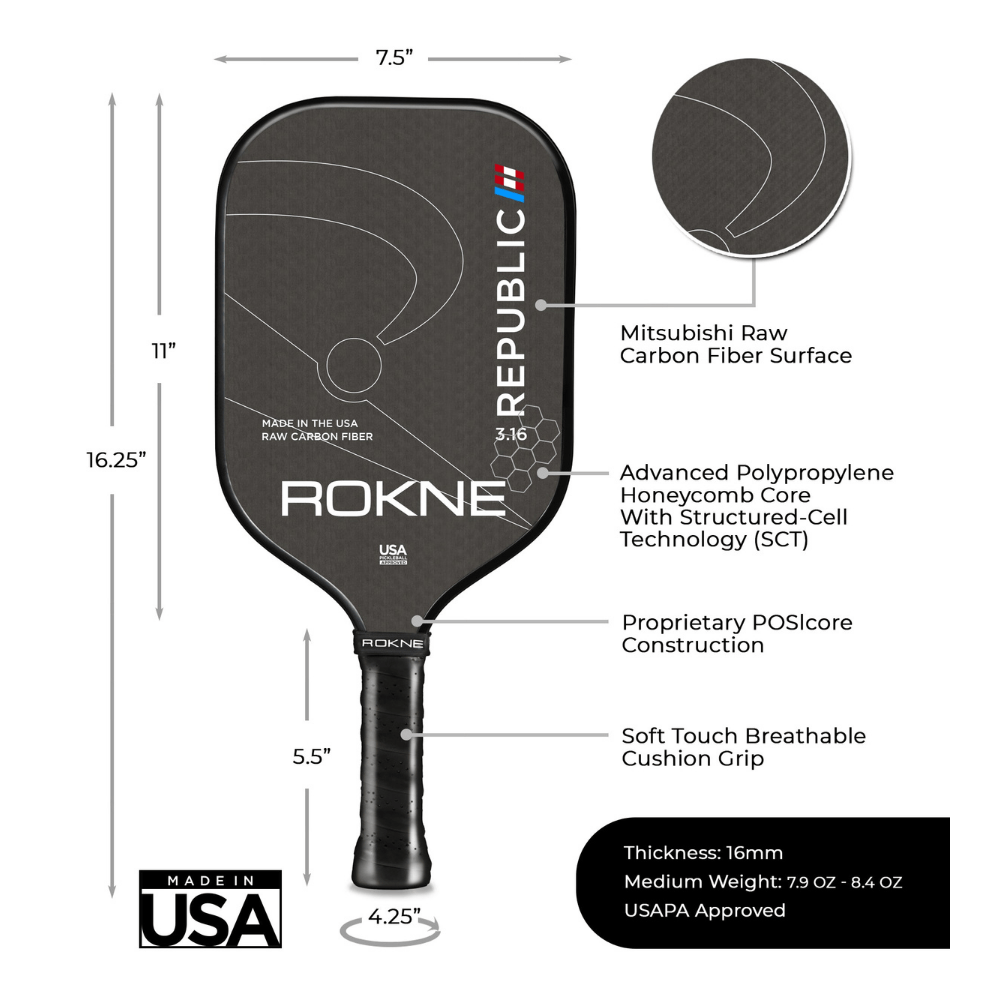 Rokne Pickleball Paddle Republic 3.16 - Raw Carbon Fiber - Widebody is backordered and will ship as soon as it is back in stock.
