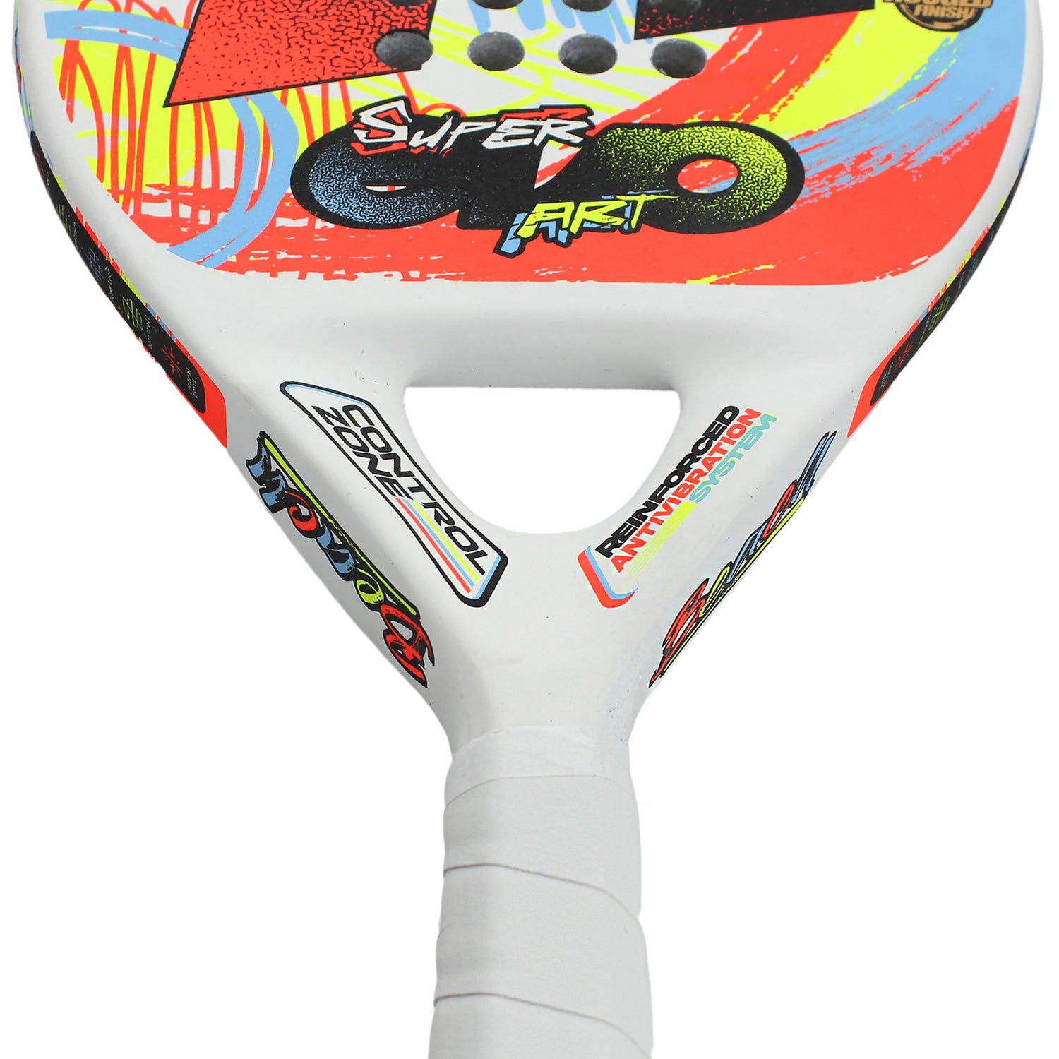 This light weight padel racket with soft core provides a soft touch and shock absorption with excellent control. Additionally, the carbon fiber gives enormous power.
