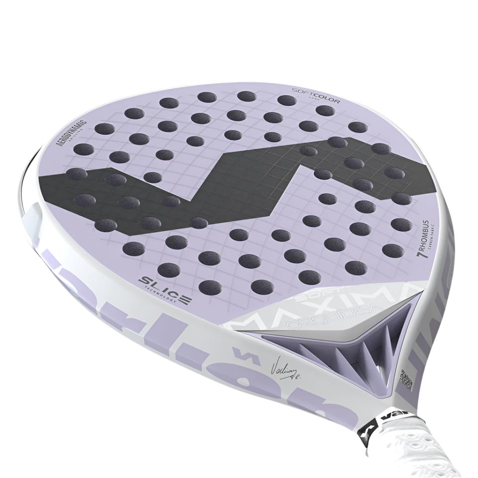 The Maxima Summum Prisma Soft Orquidea is a padel racket manufactured using a bidirectional carbon tubular. The core is made of 38 mm low-hardness SOFTCOLOR CORE EVA rubber, and is laminated through layers of carbon and fiberglass fabric, and reinforced with carbon fiber. All fabrics are impregnated with Varlion's exclusive VAR-FLEX epoxy resin, and covered with a layer of titanium dioxide.