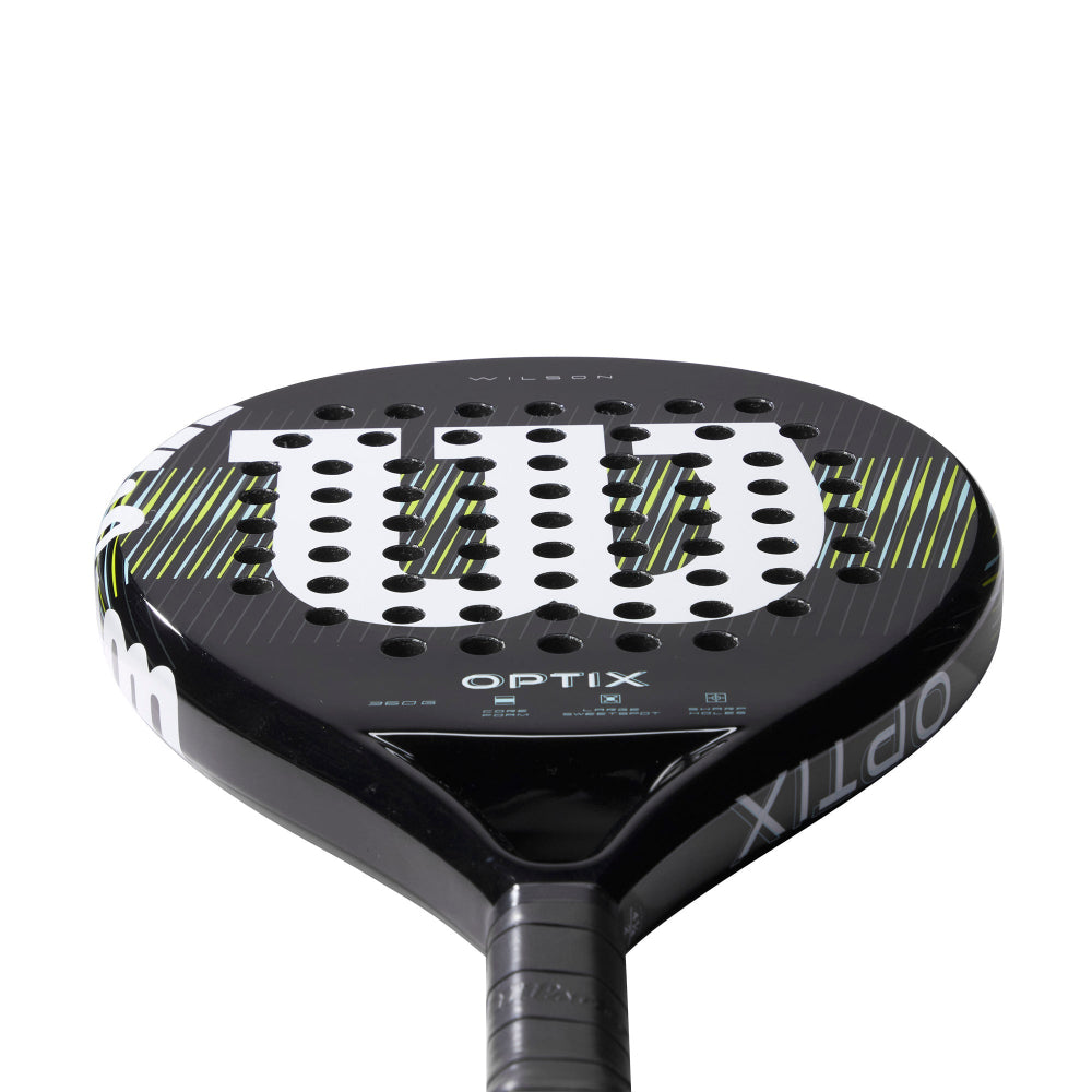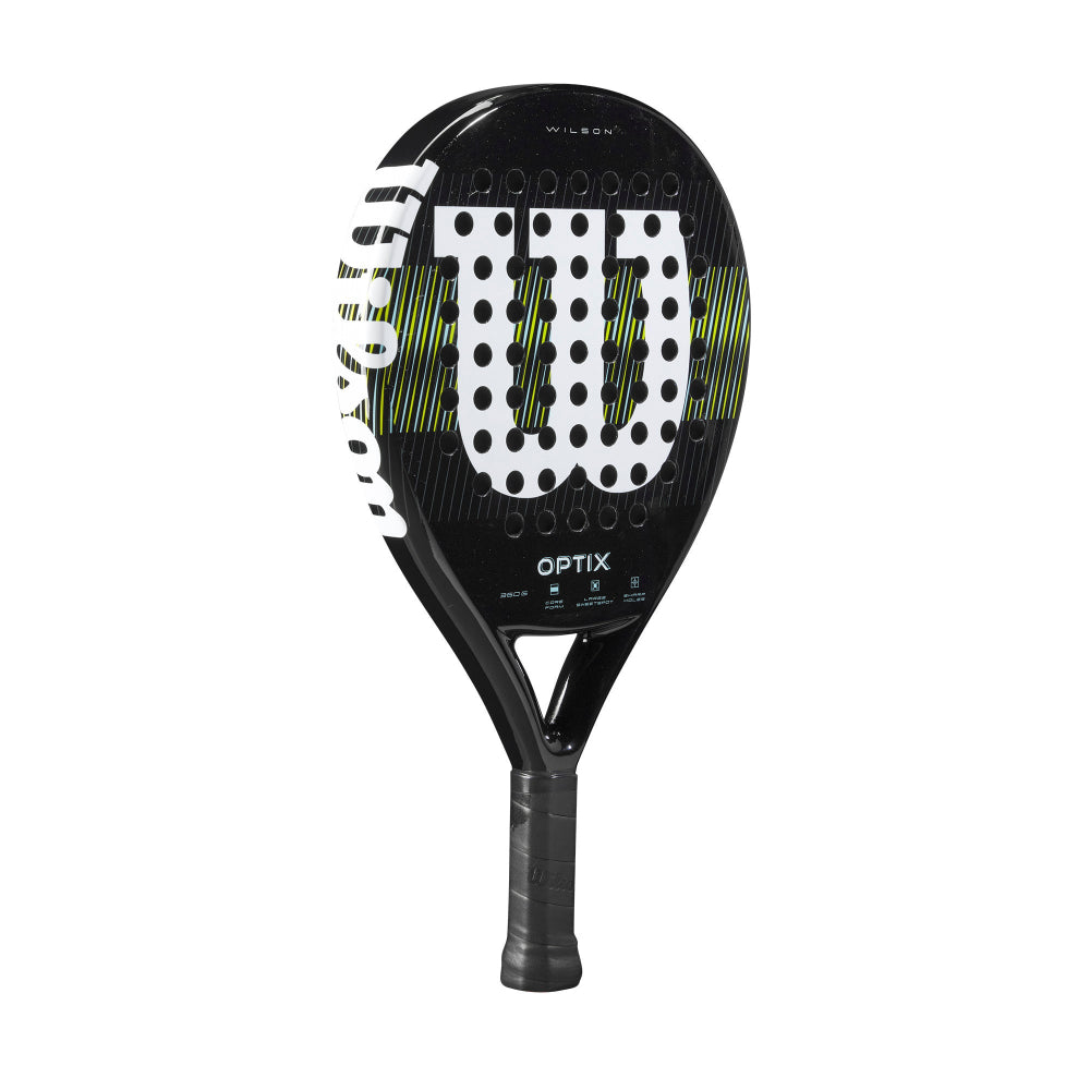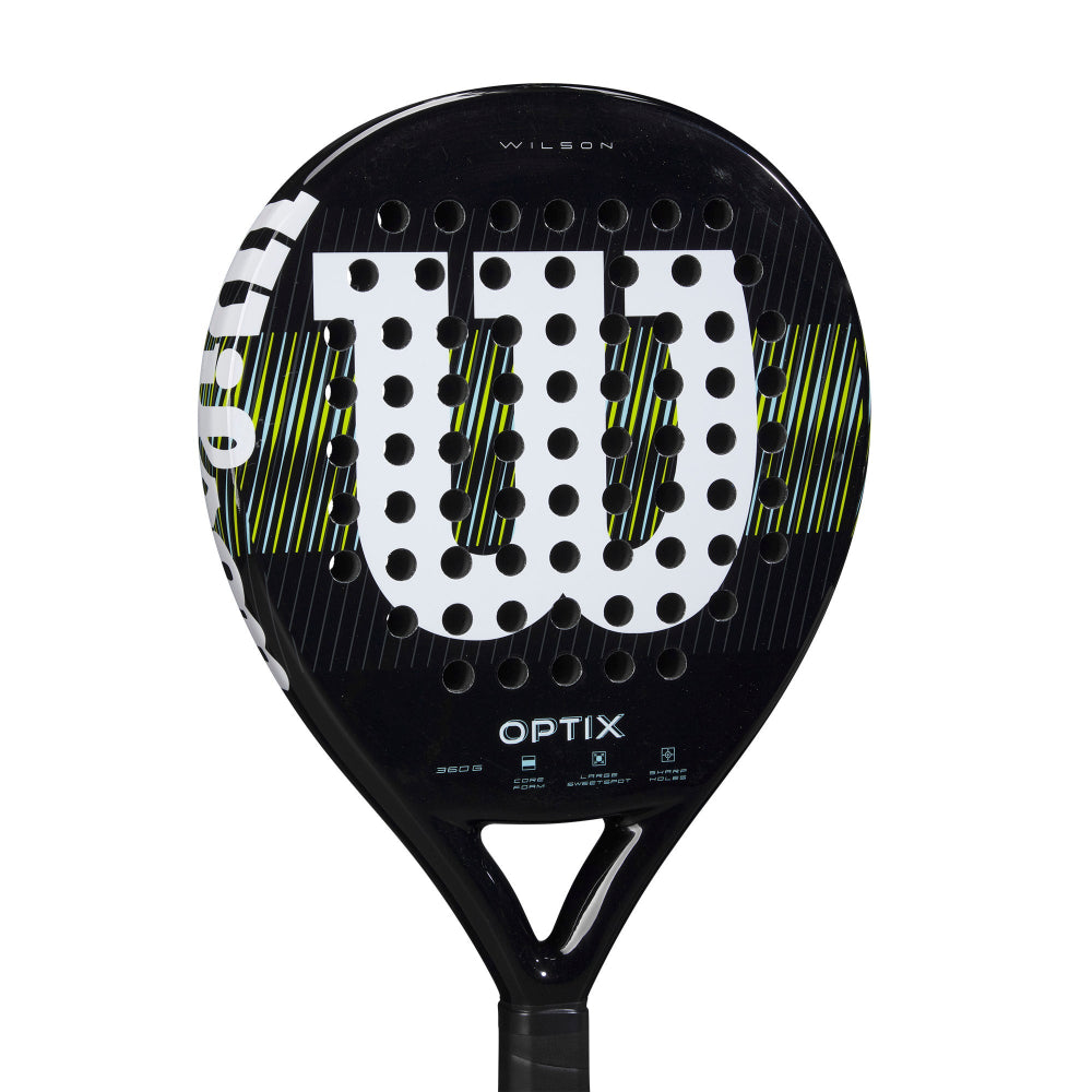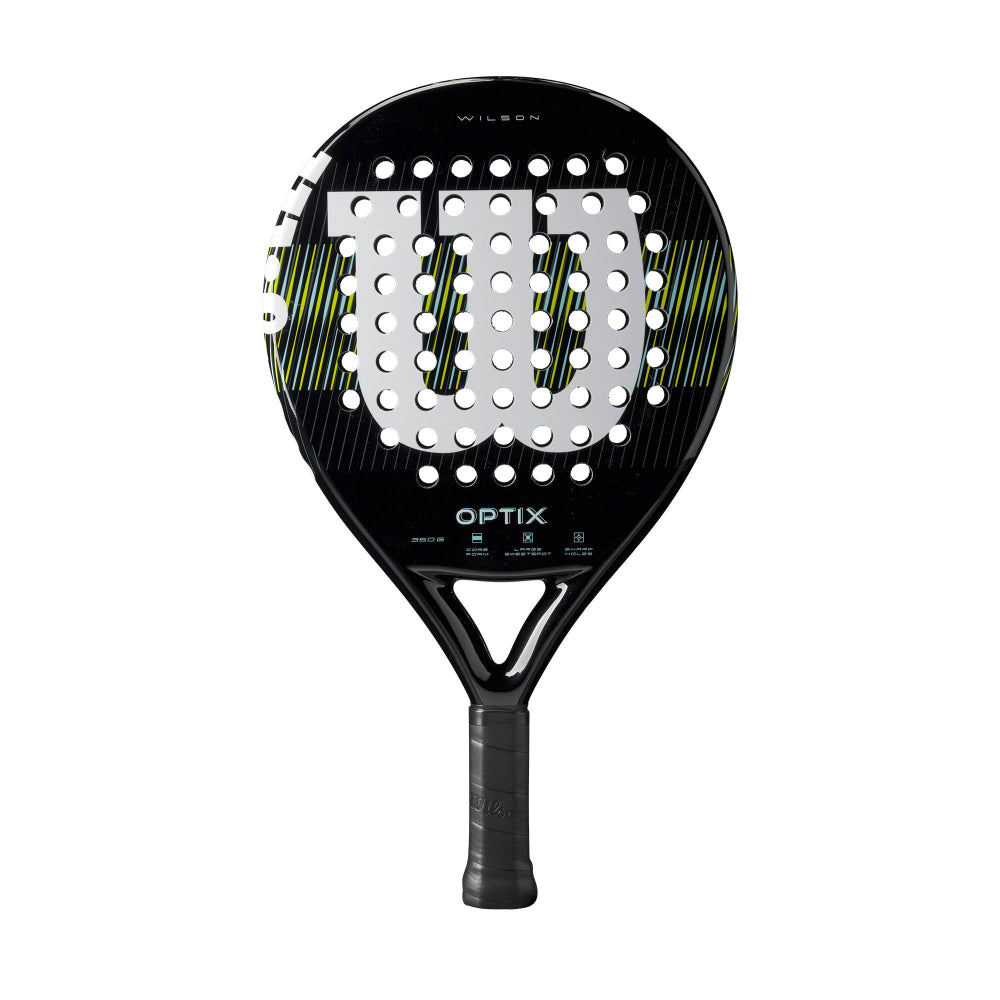 It has a woven fiberglass frame for a stable yet responsive feel with a low-density foam core that can hit with power but still feels soft. The round shape is ideal for making consistent contact, and the advanced hole-drilling technique increases bite with every stroke. Jump into the sport using Wilson's highly accessible Optix V1.
