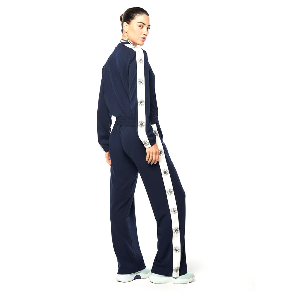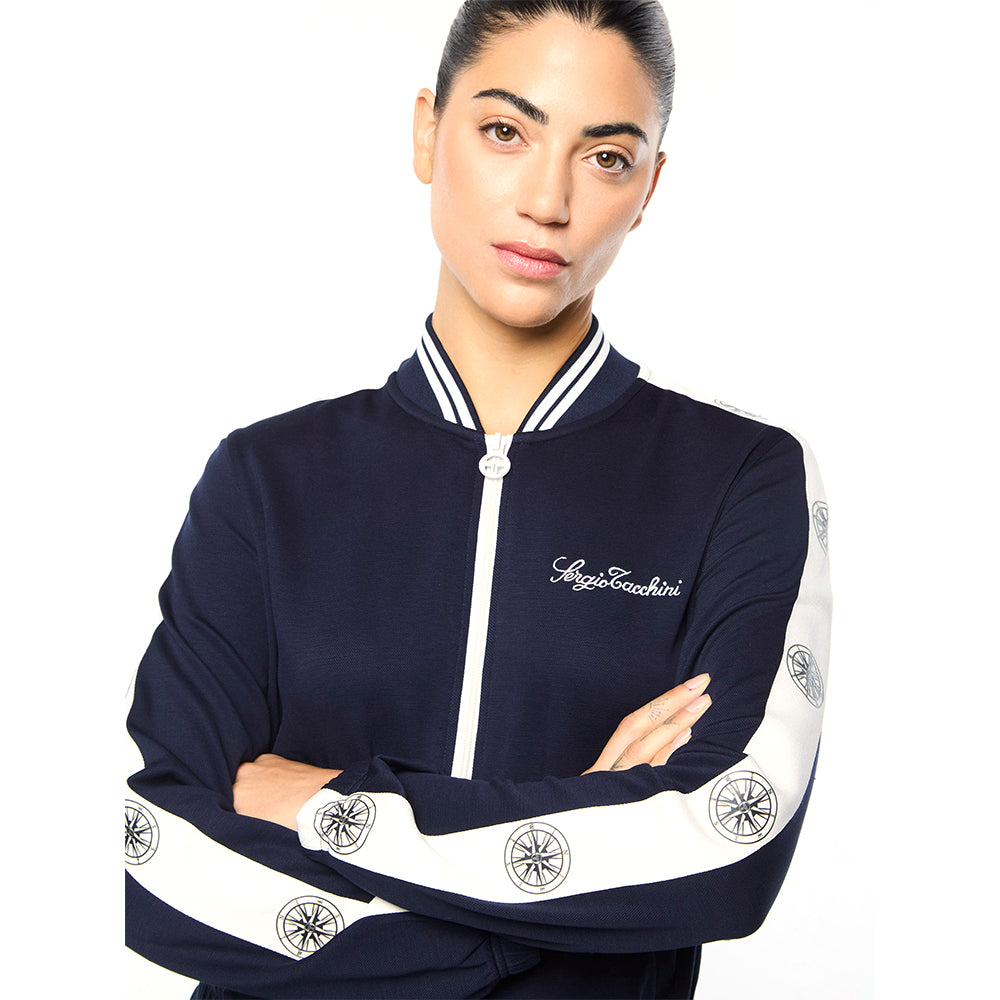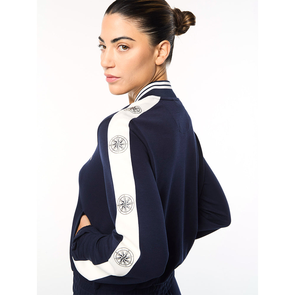 Set sail in our Women's Bussola Track Jacket, crafted from a luxurious Tencel blend piqué fabric that's soft and breathable with a subtle stretch—perfect for active individuals and athleisure-wear enthusiasts alike. Featuring nautical stripe accents and a "Compass" rose repeat motif across contrast taping down the sleeves, this refined track jacket offers style and comfort with a Riviera vibe.