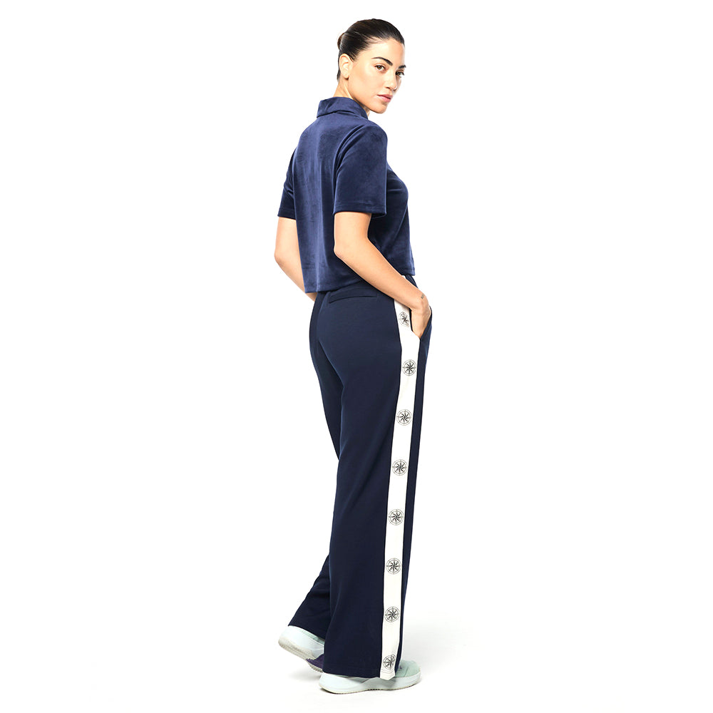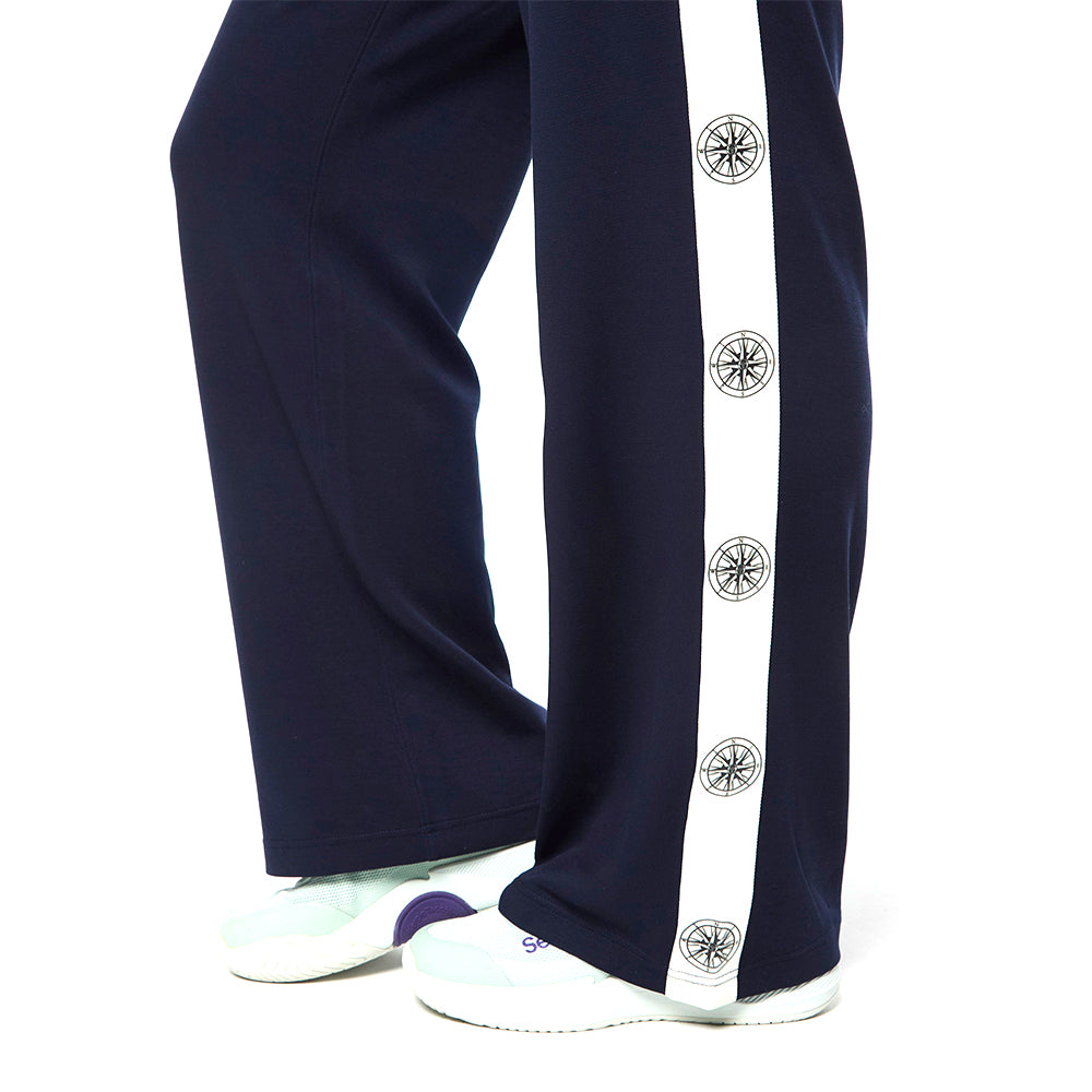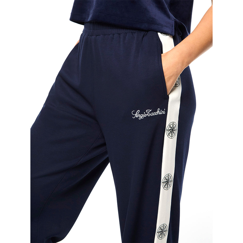 Set sail in our Women's Bussola Track Pant, crafted from a luxurious Tencel blend piqué fabric that's soft and breathable with a subtle stretch—perfect for active individuals and athleisure-wear enthusiasts alike. Featuring a nautical "Compass" rose repeat motif across contrast taping down the legs, these refined track pants offer style and comfort with a Riviera vibe.