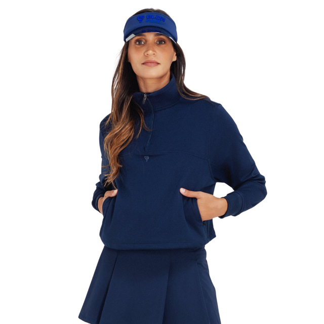 Our Women's Track Sweatshirt is your go-to layer for cooler days or warming up before a match. Designed with a cozy mock neck quarter zip and custom jacquard ribbing for extra breathability, it’s as functional as it is stylish. The cropped fit and adjustable hem let you customize your look, while rubber logo details add a sleek, sporty touch. Perfect for staying comfortable and ready, whether on the court or off. Available in multiple colorways.