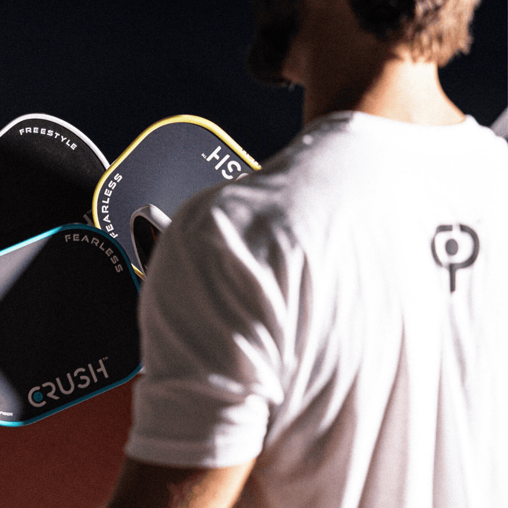 CRUSH Logo Short Sleeved T-Shirt. Look cool on and off the court. Our threads are made to keep you cool and comfortable whether you are playing pickleball or just going out for the night. Made of 60% ring spun cotton/ 40% polyester, tag-less with a baby rib/knit collar. This was made as a unisex design.