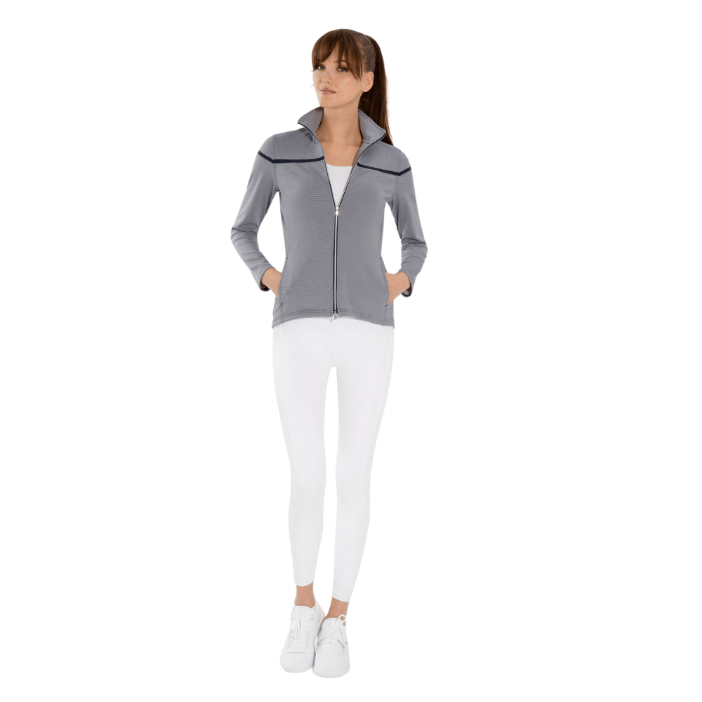 This stylishly feminine performance knit jacket puts glamour into your active wear. Slimming silhouette with contrast inset across upper chest and sleeves. Two front pockets for safekeeping of your personal items. A perfect item for warmup on tennis court or a cool day at the golf course.