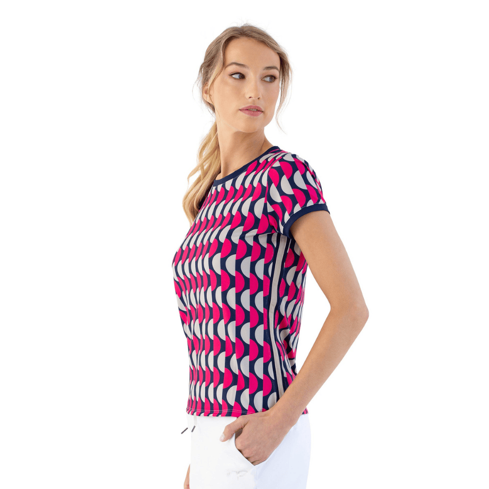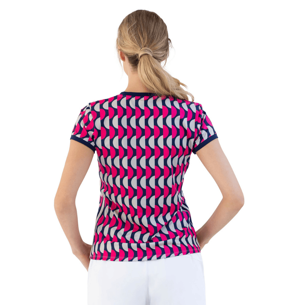 Own Your Court with the Geo Print Audrey Performance Short Sleeve Crew Neck. Unleash your inner athlete and radiate confidence in the Geo Print Audrey Performance Tank. This stylish tank, perfect for tennis, pickleball, or any workout, combines classic comfort with exceptional performance.
