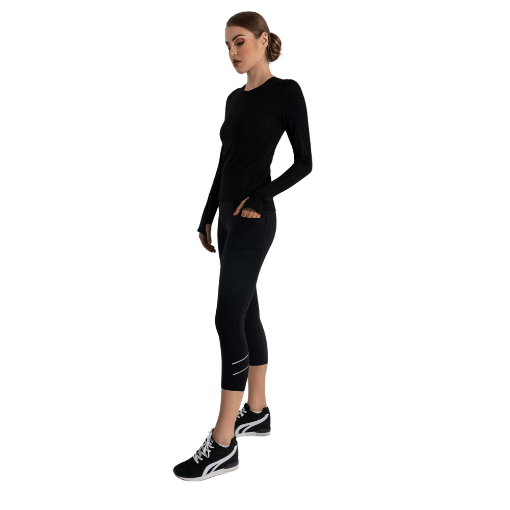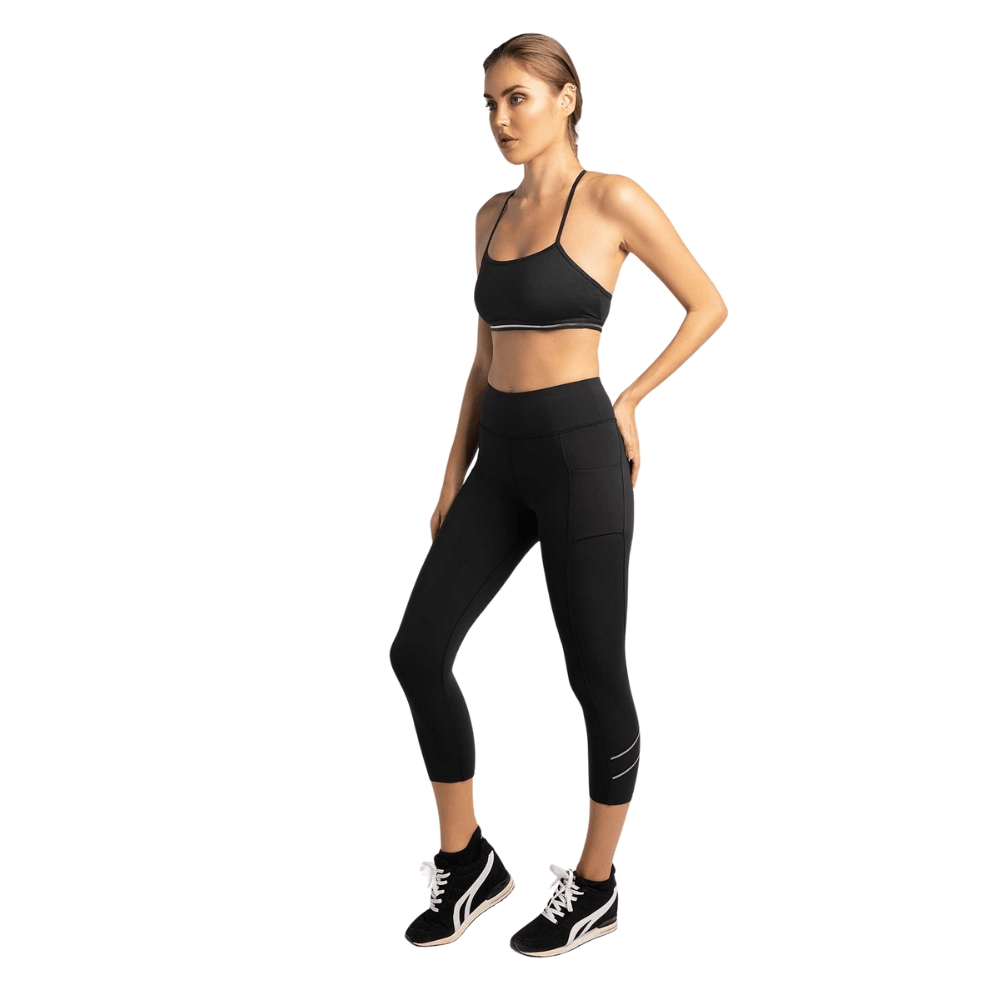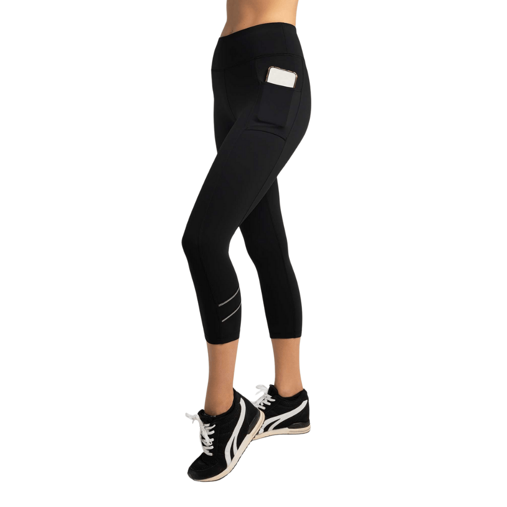 Women's Active Capri Legging - An updated to our high-waisted no sheer best selling compression capri leggings that are made from double knit grin-through reduction fabric with high waist band and side pockets. Ultra comfortable, moisture wicking, breathable compression that perfectly forms to your body. This style features stylish stretch tape with silver reflective line around the lower leg that is the signature of this collection.