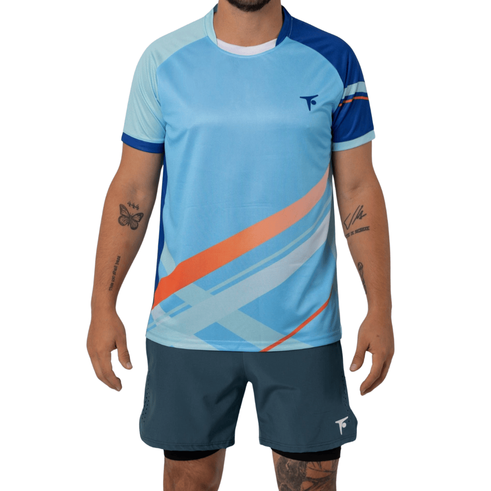- Dynamic Design: The striking graphic with bold, flowing lines in shades of blue and orange gives this tee a fast-paced look.