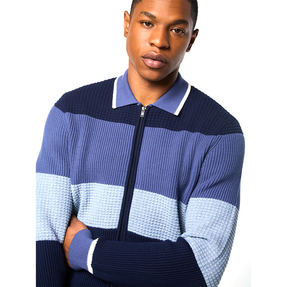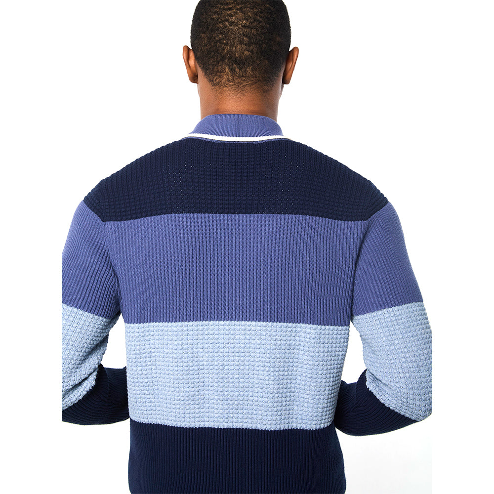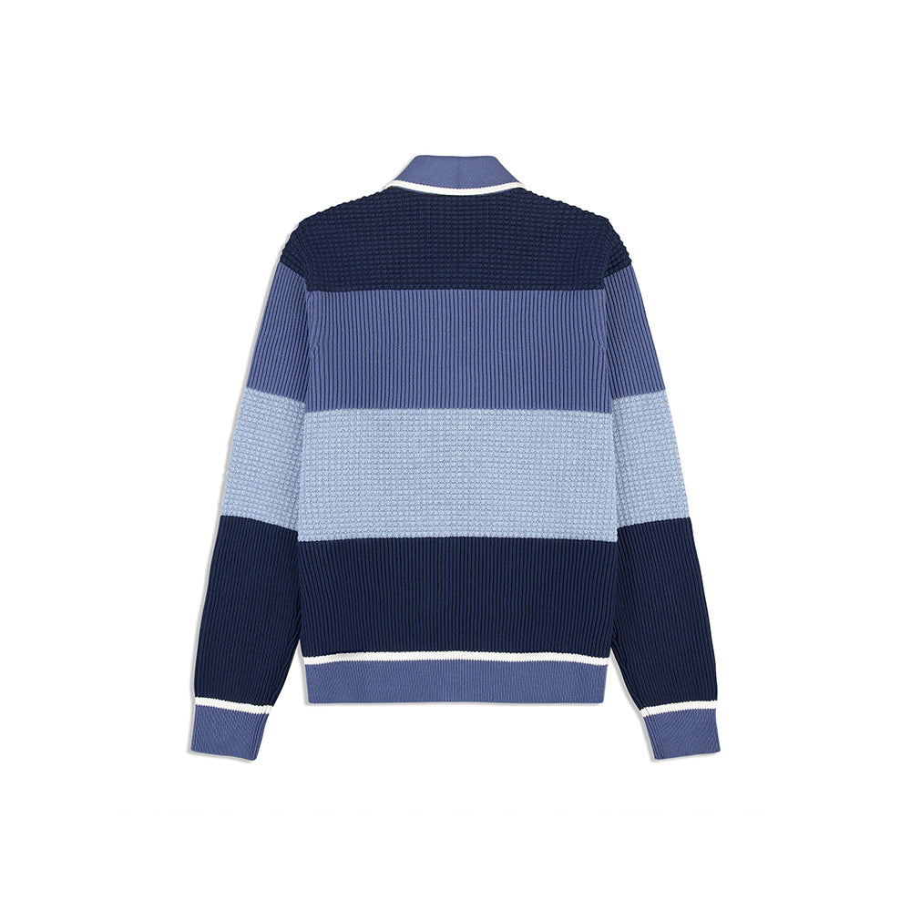 - Color-blocked body with mixed cardigan & waffle stitch panels