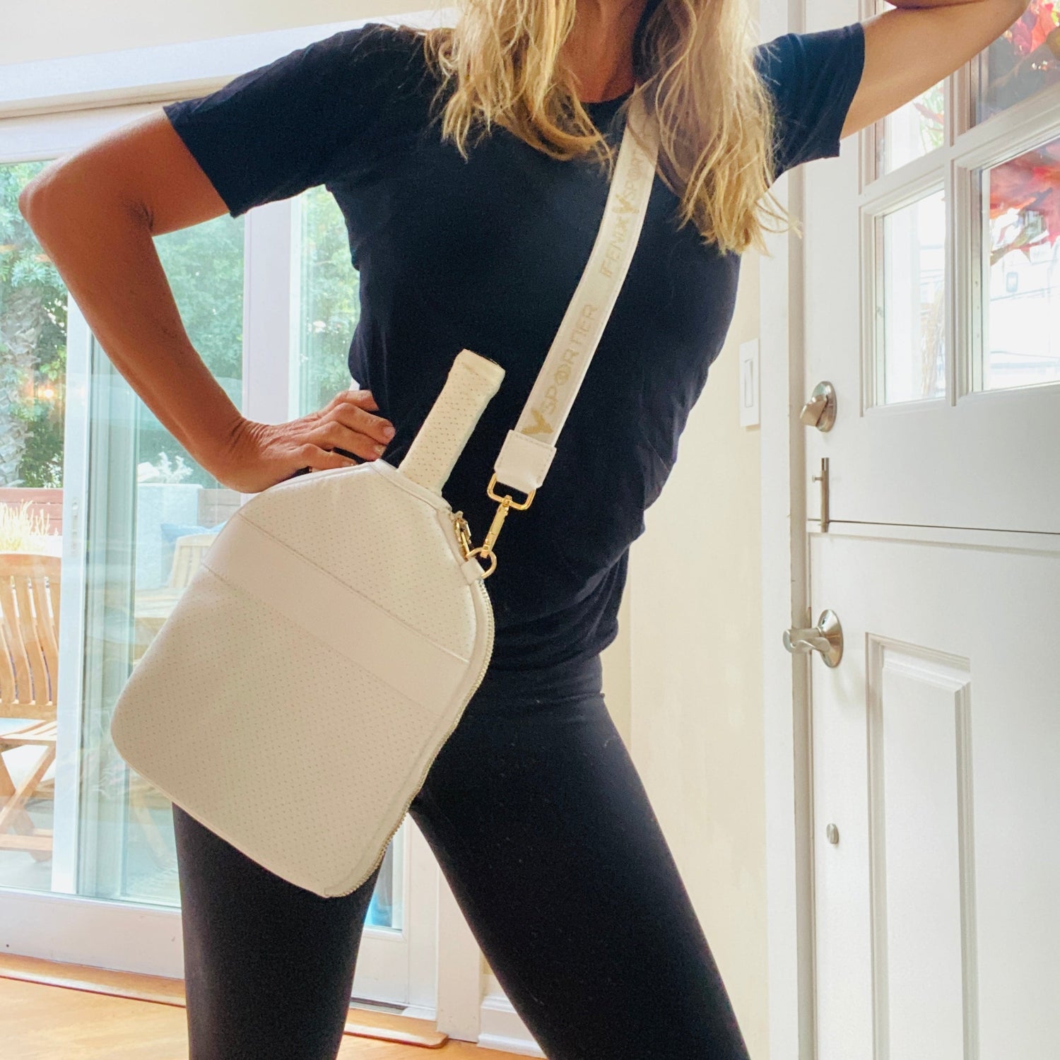 We hear it often: the (pickleball) addiction is real. So make pickleball chic. Styled and designed like our luxe tennis racket cover, this Pickleball crossbody bag/cover holds 1 or 2 paddles and has a detachable strap so it can be worn over the shoulder or crossbody.