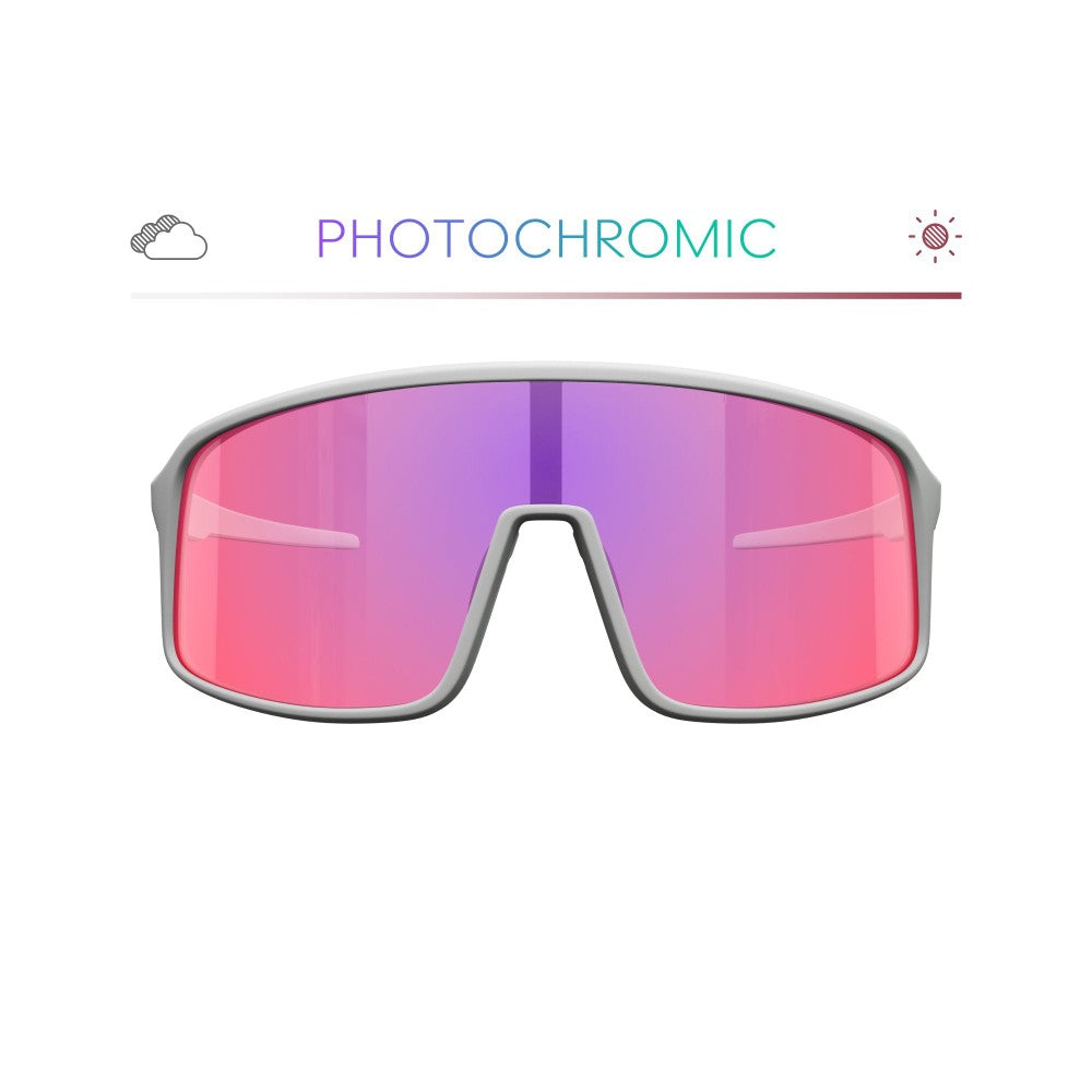 Kontrast photochromic lenses darken in the sun and lighten in the shade. Featuring a high contrast rose amber tint with a VLT range from 16% to 48% and finished with a plasma mirror, this lens provides the ultimate in all-day sports performance . Shield designed sunglasses feature a large single wrap-around lens that produces an unobstructed wide peripheral view across the wearer's field of vision. A bigger lens also means more protection from wind, rain, bugs, and dust.